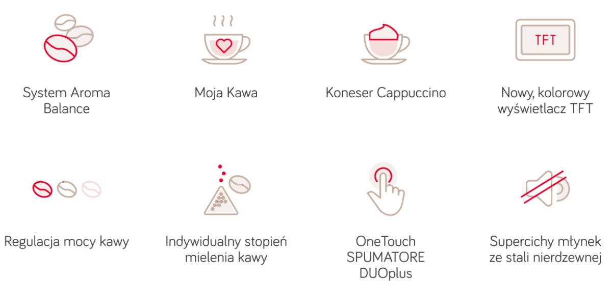 капучино одним дотиком, регулювання обсягу напою, функція спінювання молока, латте макіато або капучіно одним дотиком, можна встановити 10 профілів користувача, попередження про низький рівень кави в резервуарі, попередження про низький рівень води в резервуарі, попереднє заварювання, підсвічування чашок