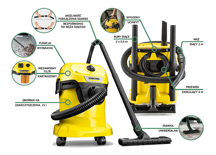 Купуючи цю універсальну модель, ви отримуєте багатозадачний пристрій з потужністю та ефективністю вище середнього. Оснащений баком на 15 л, шнуром живлення довжиною 4 м і всмоктуючим шлангом довжиною 2 м. Ідеально підходить не тільки для домашньої майстерні, але й для щоденного прибирання будинку та його прилеглої території.