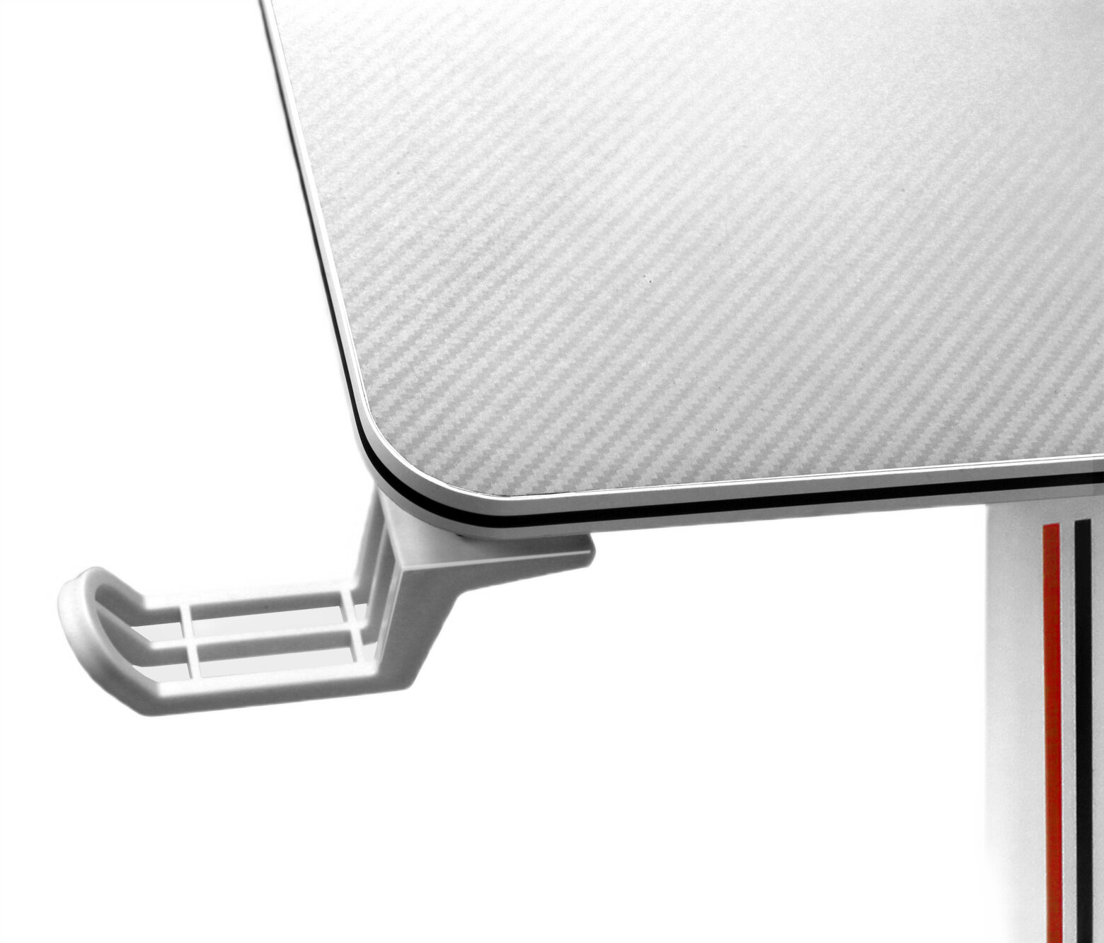 Стіл оснащений двома практичними отворами для кабелів, які допомагають підтримувати порядок на робочій поверхні, усуваючи проблему заплутаних проводів. Крім того, тримач для пляшки або пляшки з водою та тримач для навушників гарантують, що необхідні аксесуари завжди будуть під рукою, а стільниця залишатиметься вільною від непотрібних предметів. Завдяки цьому ви можете повністю зосередитися на грі, маючи все під контролем – без безладу і побоювань про пролитий напій.
