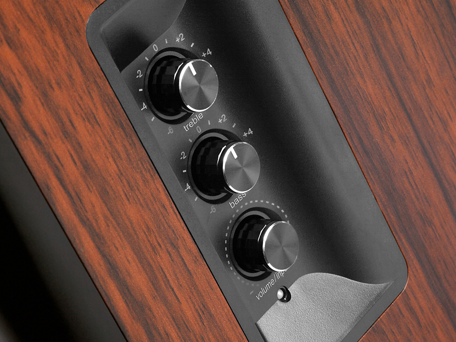 Налаштуйте звук відповідно до своїх очікувань. На бічній панелі одного з пристроїв ви знайдете 3 ручки, за допомогою яких ви точно відрегулюєте гучність, баси та високі тони. У комплект також входить зручний пульт дистанційного керування, який дозволяє дистанційно керувати динаміками. З його допомогою ви можете, наприклад, перемкнути пісню, вимкнути звук або зупинити відтворення, не рухаючись з зручного дивана.