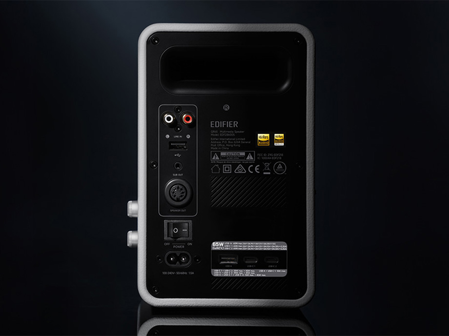 Динамік Edifier QR65 - це універсальний пристрій, який не тільки відтворює музику, але й підтримує передову технологію TurboGaN, що дозволяє швидко заряджати багато різних пристроїв, таких як смартфони, планшети або бездротові навушники. Він має три вихідні порти: два USB-C і один USB-A, що дозволяє одночасно заряджати кілька пристроїв. З максимальною потужністю зарядки до 65 Вт і підтримкою швидкої зарядки PD, PD3.0 PPS і QC в одну мить відновить енергію вашого обладнання.