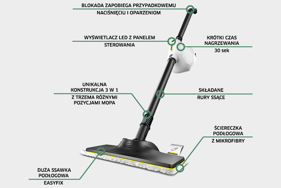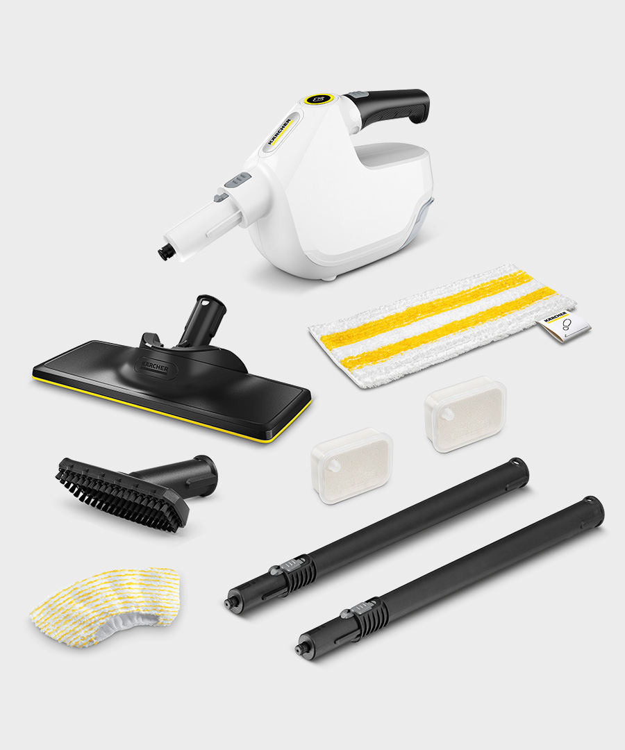 Парова швабра SC 1 Multi & Up Plus - це багатофункціональний пристрій, який можна використовувати в трьох положеннях - верхній, середній і нижній - або як ручний відпарювач. Вона готова до роботи вже через 30 секунд. Завдяки набору підлогових присосок EasyFix Large ви можете вільно перемикатися між функцією ручного випарника та паровою шваброю 3 в 1, забезпечуючи швидке та ефективне прибирання всього будинку.