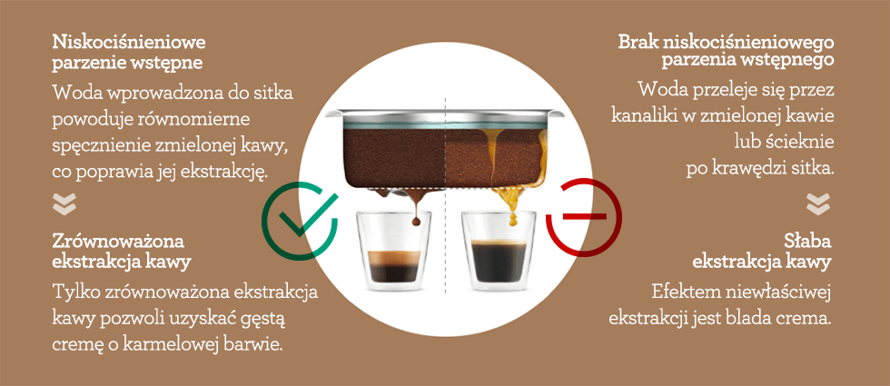 Інтенсивний, кремовий еспресо карамельного кольору починається з попереднього інфузії низького тиску, за яким слідує правильний процес екстракції під постійним тиском 9 бар, отриманий завдяки італійському насосу потужністю 15 бар.