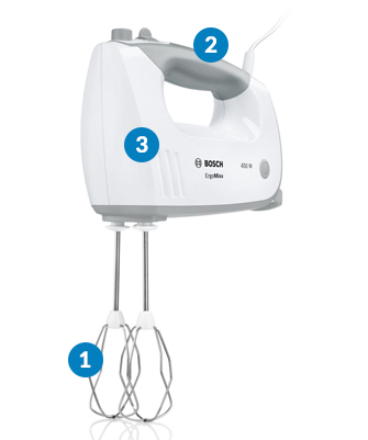 Bosch MFQ36445 оснащений двигуном потужністю 450 Вт.Апарат без проблем замішує великі обсяги тіста і ідеально змішує різні інгредієнти. Висока потужність означає, що ви можете використовувати найвищі швидкості, коли хочете обмежити час приготування.